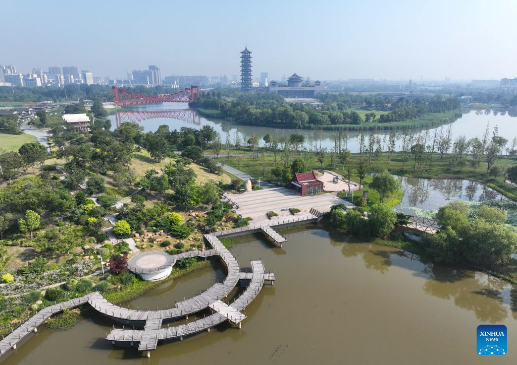 This aerial photo taken on June 15, 2023 shows a view of the Slender West Lake scenic spot in Yangzhou, east China's Jiangsu Province. (Xinhua/Ji Chunpeng)