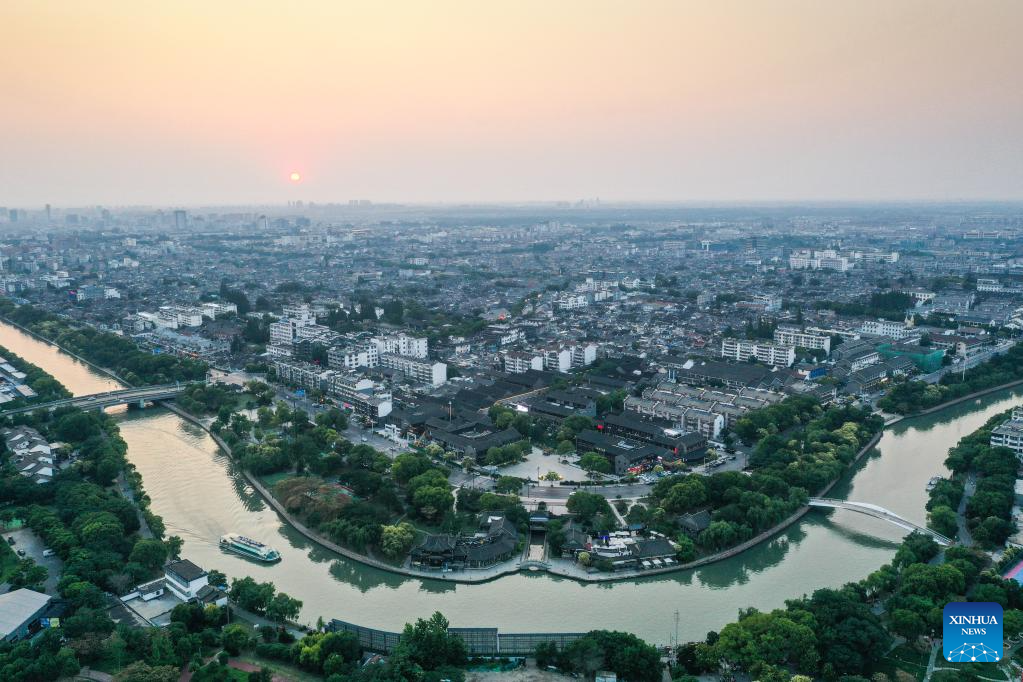 This aerial photo taken on June 14, 2023 shows a view of the Grand Canal in Yangzhou, east China's Jiangsu Province. (Xinhua/Yang Lei)