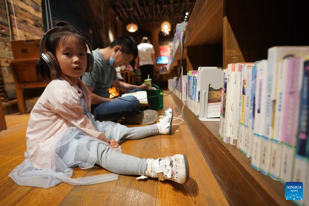 A child listens to stories at a bookshop in Yangzhou, east China's Jiangsu Province, June 15, 2023. (Xinhua/Ji Chunpeng)