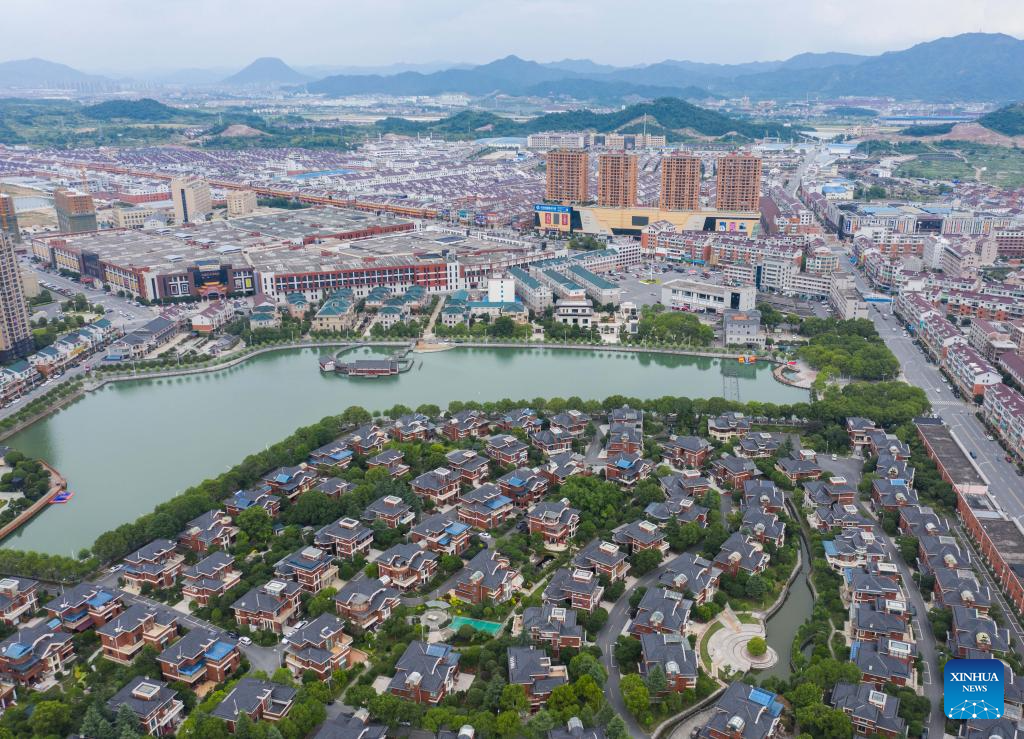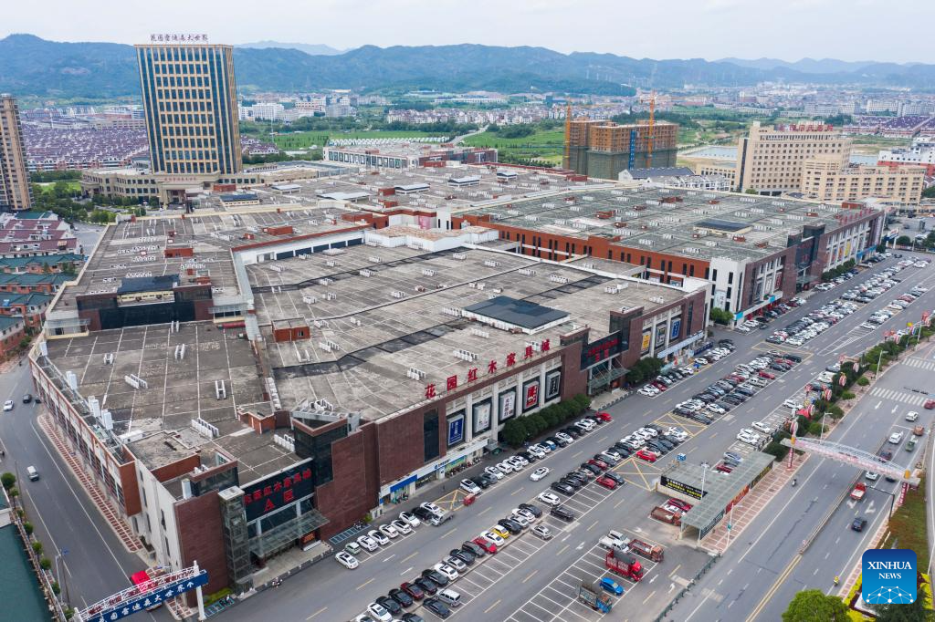 This aerial photo taken on June 19, 2023 shows a mahogany furniture market in Huayuan Village of Nanma Town, Dongyang City, east China's Zhejiang Province. (Xinhua/Xu Yu)