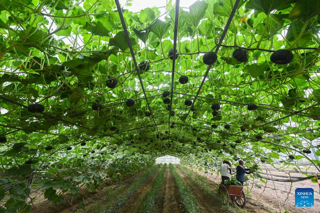 Farmers harvest pumpkins at an agricultural ecological park in Huayuan Village of Nanma Town, Dongyang City, east China's Zhejiang Province, June 19, 2023. (Xinhua/Xu Yu)
