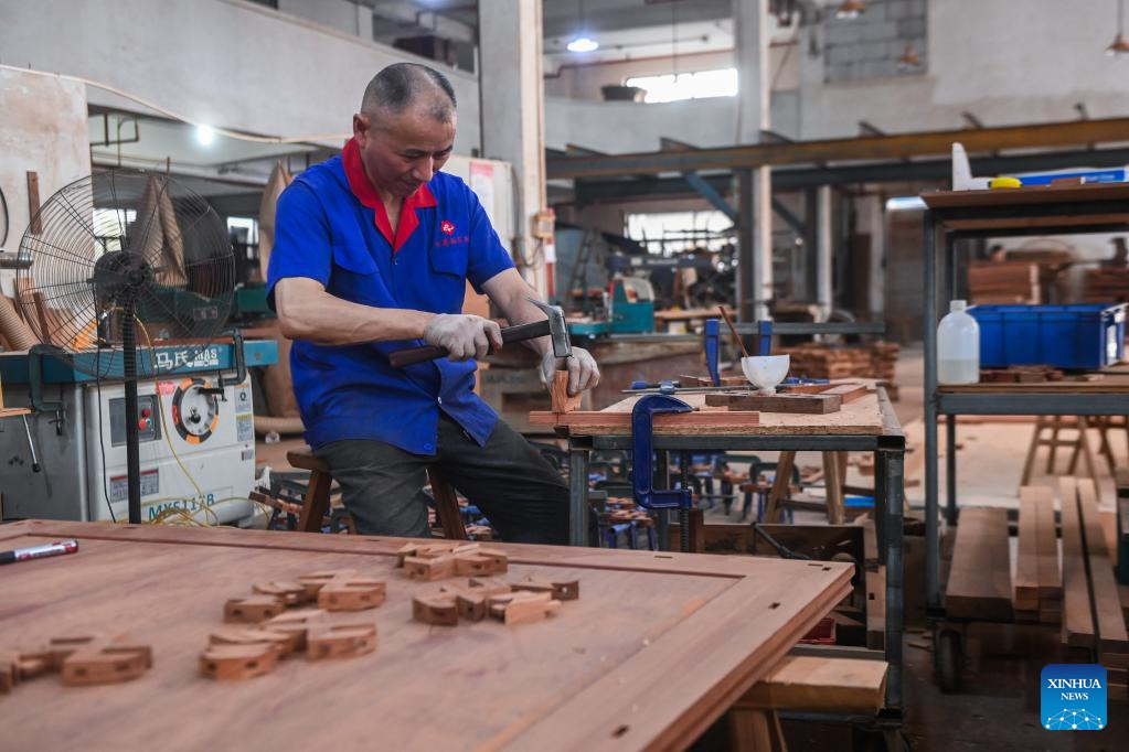 An employee works at a furniture plant in Huayuan Village of Nanma Town, Dongyang City, east China's Zhejiang Province, June 19, 2023. (Xinhua/Xu Yu)
