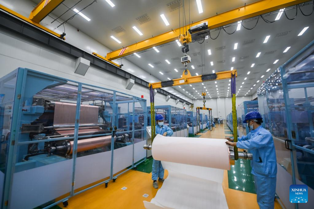 Employees work at a workshop of a new energy company in Huayuan Village of Nanma Town, Dongyang City, east China's Zhejiang Province, June 19, 2023. (Xinhua/Xu Yu)