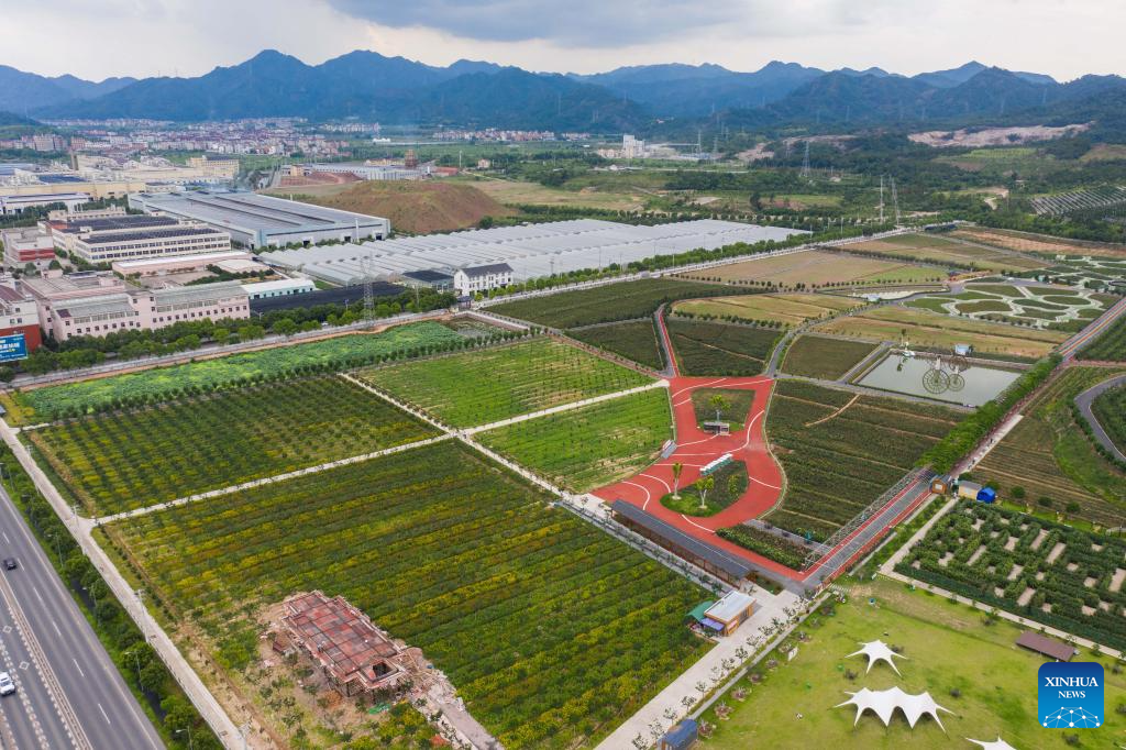 This aerial photo taken on June 19, 2023 shows an agricultural ecological park in Huayuan Village of Nanma Town, Dongyang City, east China's Zhejiang Province. (Xinhua/Xu Yu)