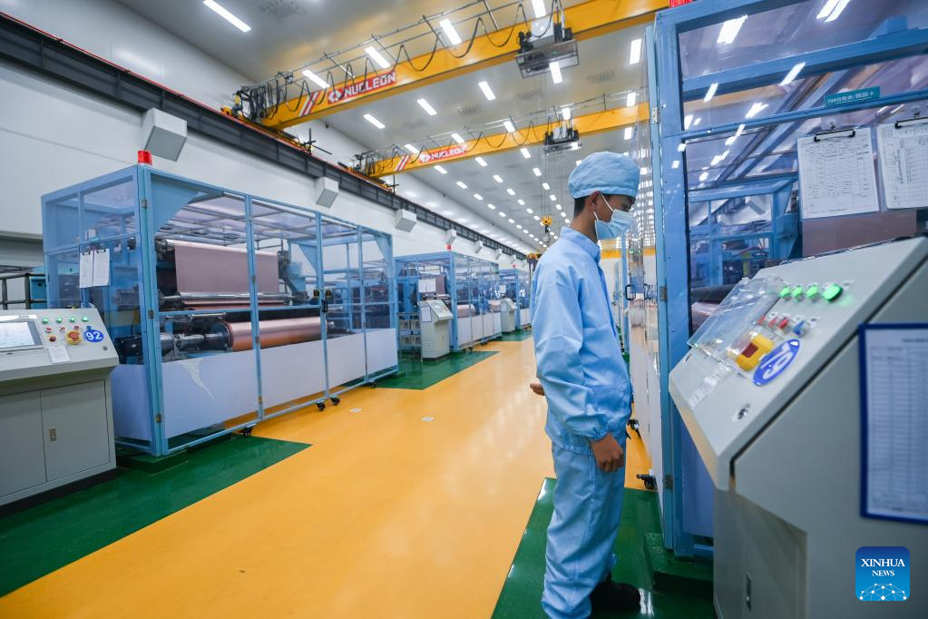 An employee works at a workshop of a new energy company in Huayuan Village of Nanma Town, Dongyang City, east China's Zhejiang Province, June 19, 2023. (Xinhua/Xu Yu)