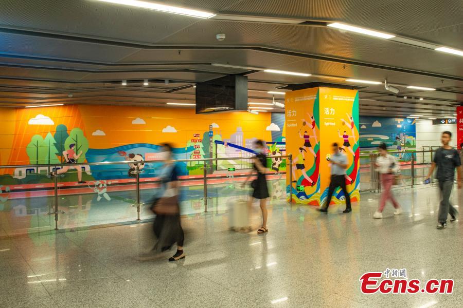 Passengers walk at a Universiade themed subway station in Chengdu, southwest China's Sichuan Province, June 20, 2023. (Photo: China News Service/Liu Zhongjun)