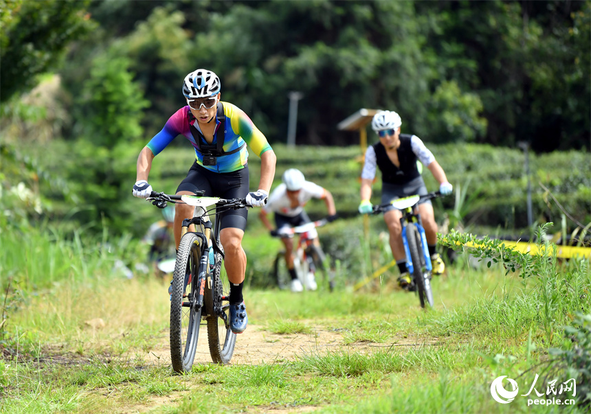 Cyclists compete in a mountain bike cross-country race in an eco-friendly tea plantation in Renshou township, Jing'an county, east China's Jiangxi Province, June 18, 2023. (People's Daily Online/Shi Yu)