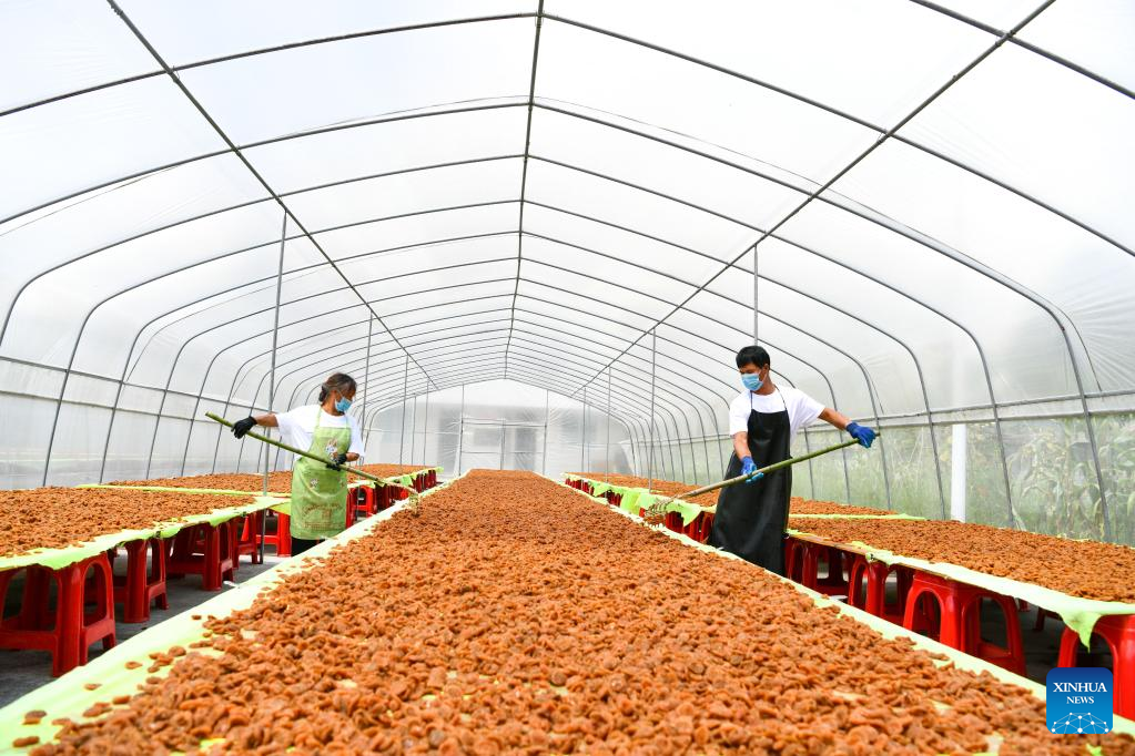 Farmers dry thorn pears at a cooperative in Gujiao Town of Longli County, southwest China's Guizhou Province, Aug. 18, 2021.(Xinhua/Yang Wenbin)