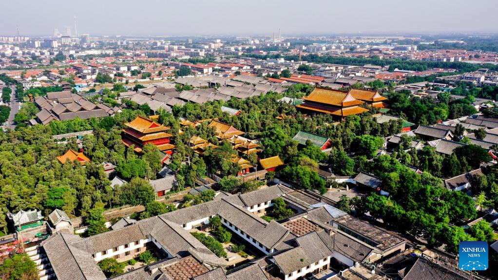 This aerial photo taken on June 8, 2023 shows the Confucius Temple, the Kong family mansion and surrounding urban view in Qufu City, east China's Shandong Province. (Xinhua/Guo Xulei)