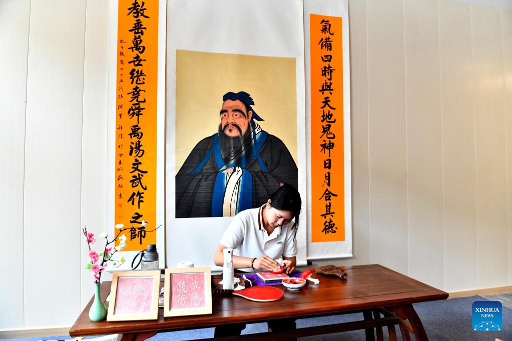A staff member makes a seal at a cultural community at the foot of Nishan Mountain in Qufu City, east China's Shandong Province, June 8, 2023. (Xinhua/Guo Xulei)