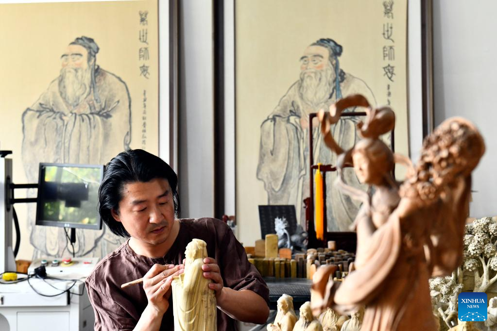 An artist makes a sculpture of Confucius at a Confucius sculpture research institute in Qufu City, east China's Shandong Province, June 8, 2023. (Xinhua/Guo Xulei)