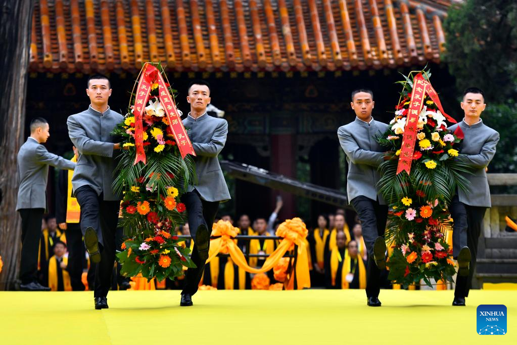 Staff members walk to lay wreaths during a sacrifice ceremony for Confucius in Qufu City, east China's Shandong Province, Sept. 28, 2021. (Xinhua/Guo Xulei)