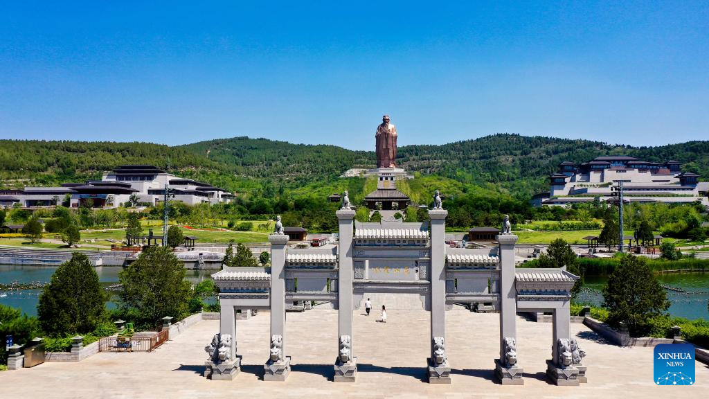Students from Jinan City pose for a group photo with the sculpture of Confucius during a travelling study tour at Nishan Sacredland in Qufu City, east China's Shandong Province, June 8, 2023. (Xinhua/Guo Xulei)