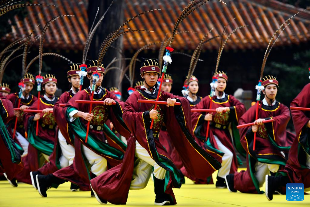 People perform dancing during a sacrifice ceremony for Confucius at the Confucius Temple in Qufu City, east China's Shandong Province, Sept. 28, 2021. (Xinhua/Guo Xulei)