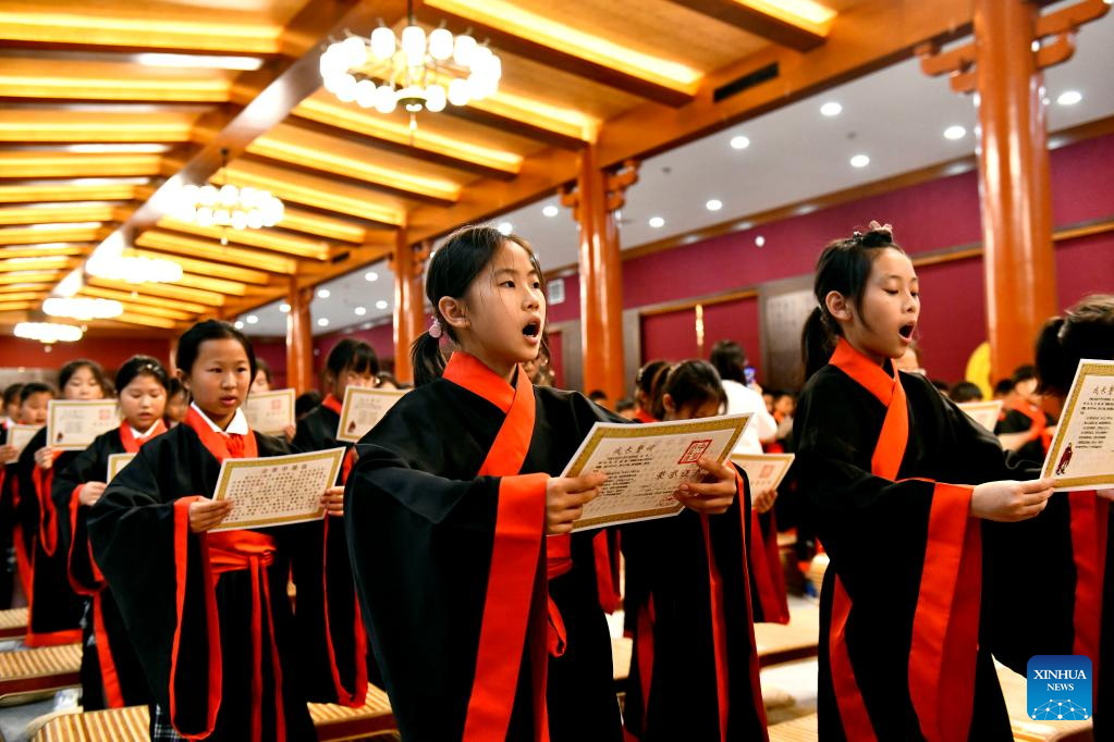 Students from Jinan City recite classics during a travelling study tour in Qufu City, east China's Shandong Province, June 9, 2023. (Xinhua/Guo Xulei)