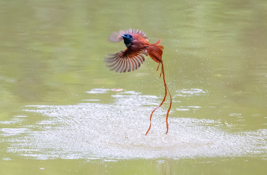 An Amur paradise flycatcher flies over water at the Dongzhai National Nature Reserve in Luoshan county, Xinyang city, central China's Henan Province. (Photo/Lin Zhongxin)