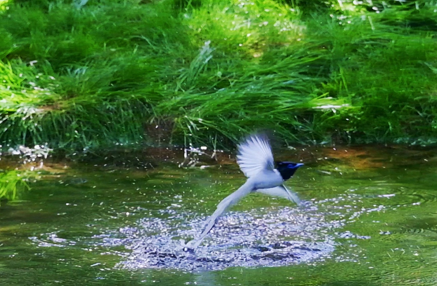 A white Amur paradise flycatcher flies over water in Lushan county, Pingdingshan city, central China's Henan Province. (Photo/Li Hongmin)