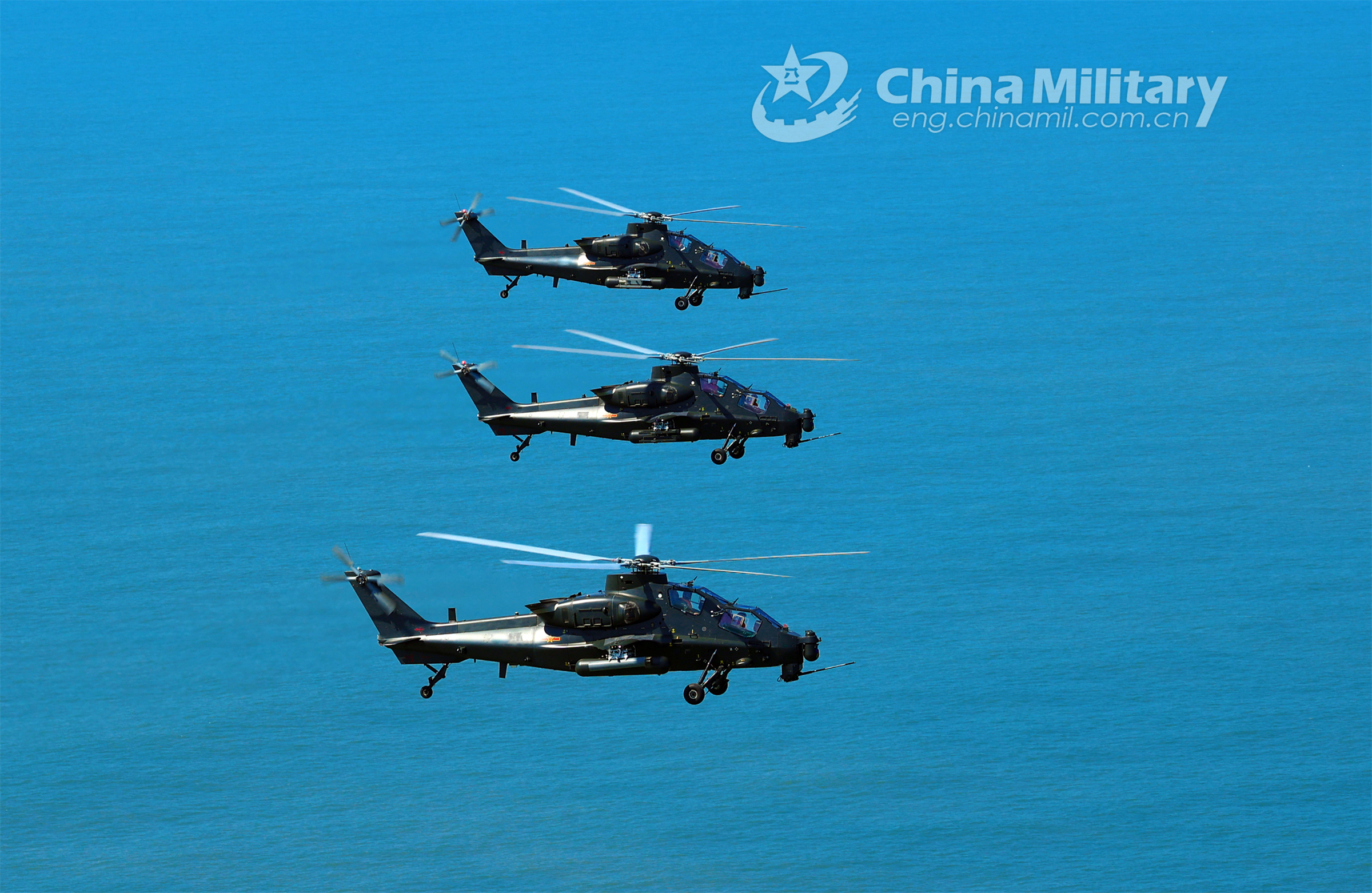 Three attack helicopters attached to an army brigade under the PLA Eastern Theater Command fly in formation over the sea during a flight training exercise on June 9, 2023. (eng.chinamil.com.cn/Photo by Zhang Huanpeng)