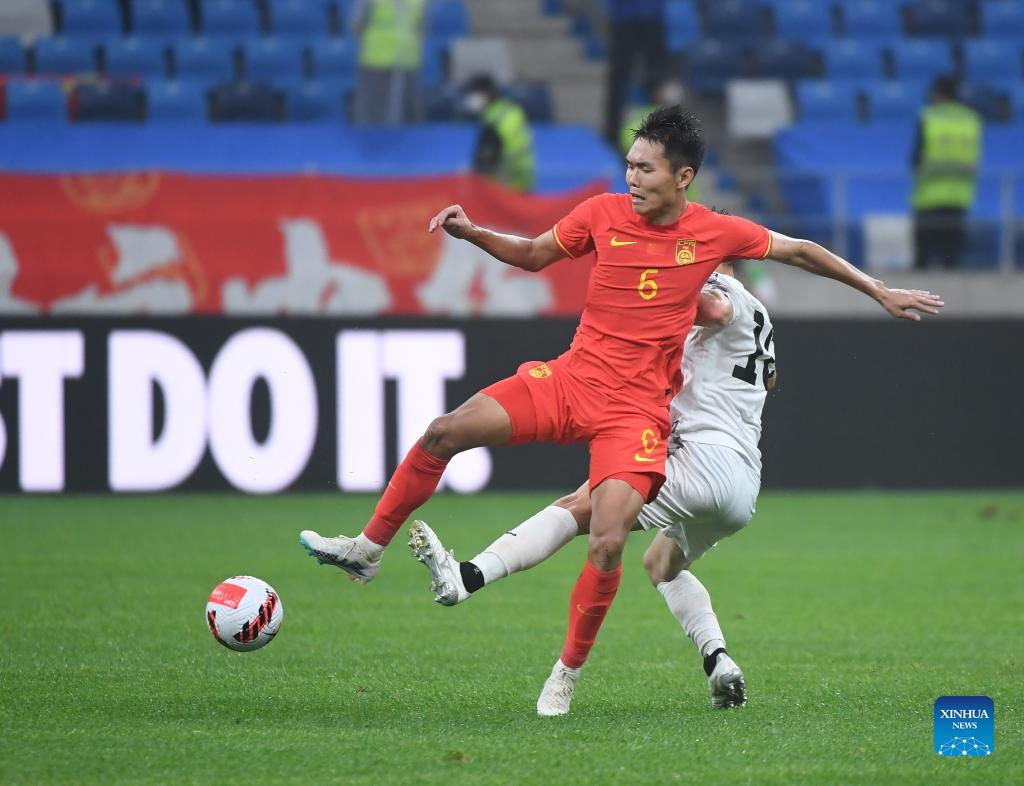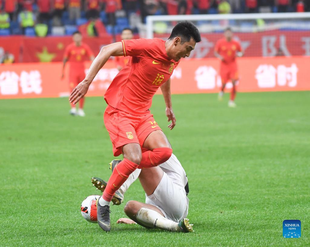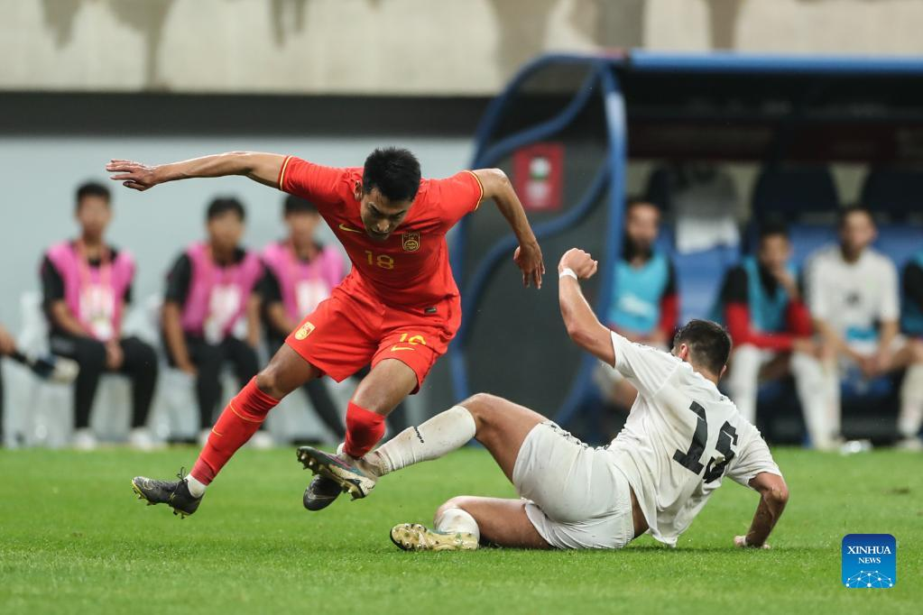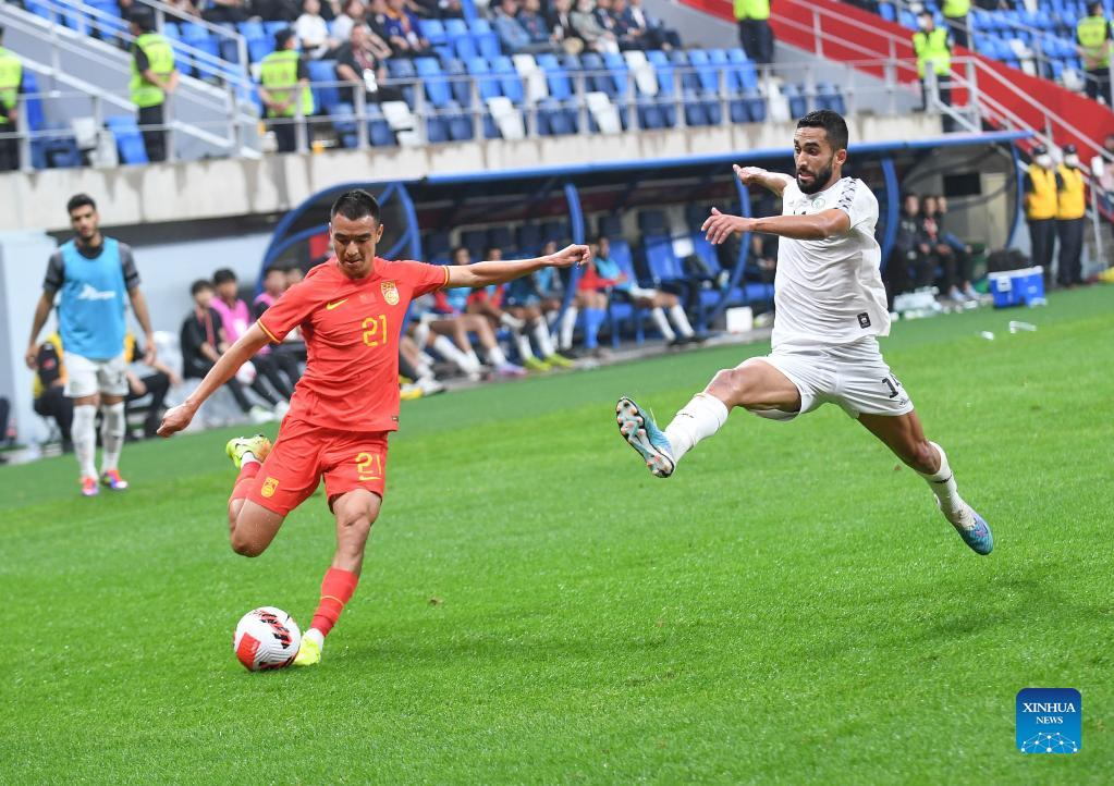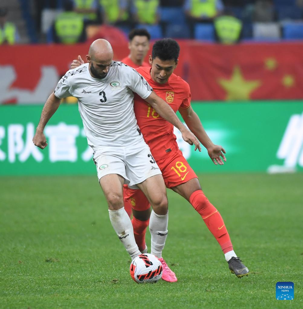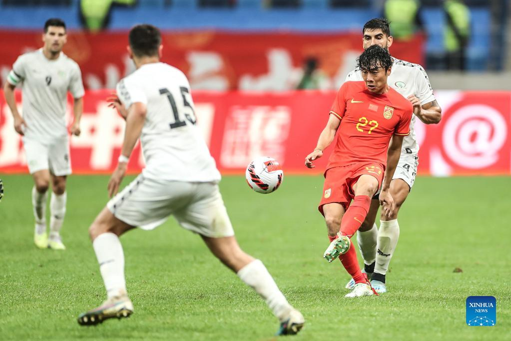 Xu Xin (1st R) of China breaks through during an international friendly football match between China and Palestine in Dalian, northeast China's Liaoning Province, June 20, 2023. (Xinhua/Pan Yulong)