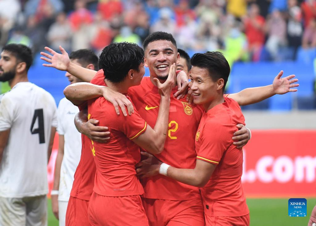 Jiang Guangtai (C) of China celebrates scoring during an international friendly football match between China and Palestine in Dalian, northeast China's Liaoning Province, June 20, 2023. (Xinhua/Long Lei)