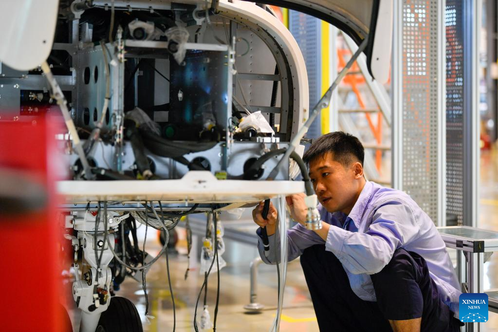 A staff member assembles an AC312E civil helicopter at the Aviation Industry Corporation of China (AVIC) Tianjin Helicopter Co., Ltd. in north China's Tianjin, June 20, 2023. The company has been boosting the development of civil helicopters industry and is now able to produce civil helicopters including AC312E, AC332 and AC352. (Xinhua/Sun Fanyue)