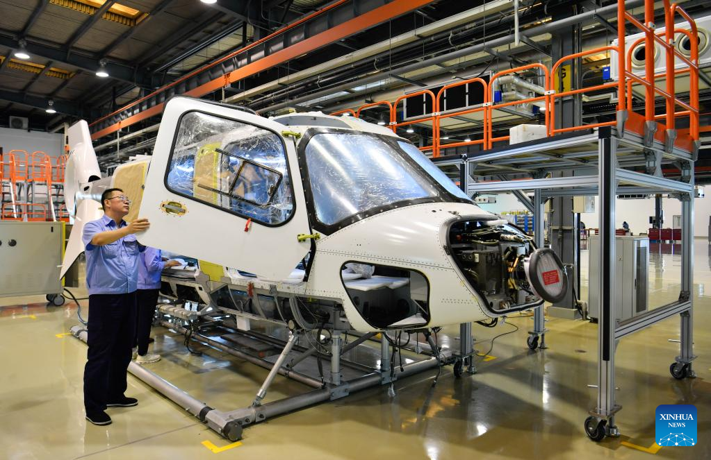 A staff member assembles an AC332 civil helicopter at the Aviation Industry Corporation of China (AVIC) Tianjin Helicopter Co., Ltd. in north China's Tianjin, June 20, 2023. The company has been boosting the development of civil helicopters industry and is now able to produce civil helicopters including AC312E, AC332 and AC352. (Xinhua/Sun Fanyue)