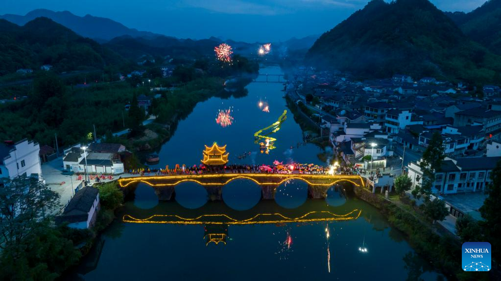 This aerial photo taken on June 16, 2023 shows a lantern performance in Hule Town of Ningguo City, east China's Anhui Province. Hule Town, an ancient town in east China's Anhui Province, has a tradition of lantern performance to celebrate festivals.