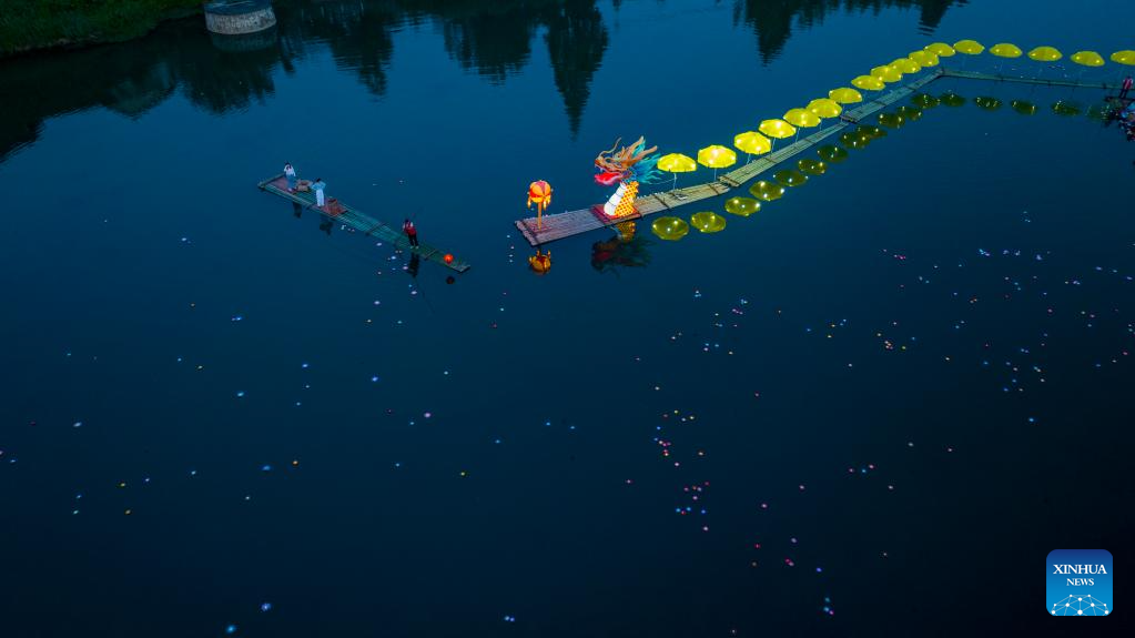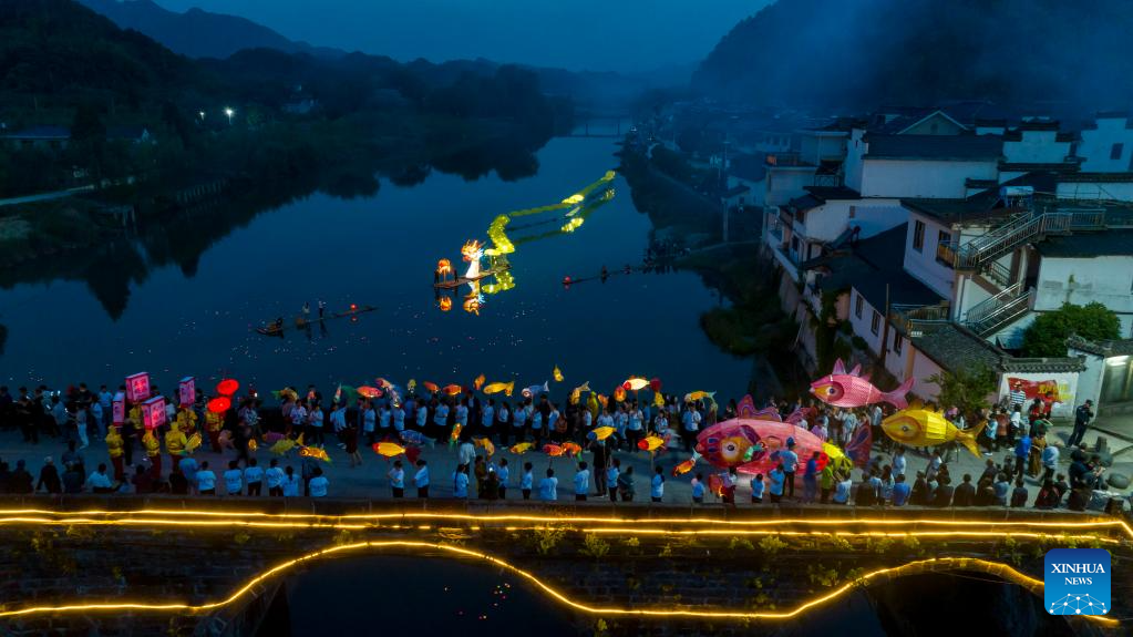 This aerial photo taken on June 16, 2023 shows a lantern performance in Hule Town of Ningguo City, east China's Anhui Province. Hule Town, an ancient town in east China's Anhui Province, has a tradition of lantern performance to celebrate festivals. Villagers perform lantern dance with lanterns in the shape of fish and dragon, and place lotus-shaped water lanterns in the river. A series of activities including the long-table banquet and the lantern fair have been held to attract tourists from home and abroad. (Photo by Li Xiaohong/Xinhua)