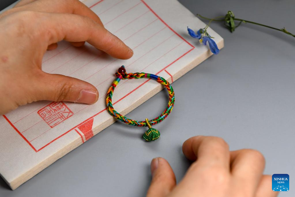 A traditional string-weaving technique inheritor shows a string-woven bracelet specially designed for the Dragon Boat Festival in Changchun, northeast China's Jilin Province, June 20, 2023. (Xinhua/Zhang Nan)