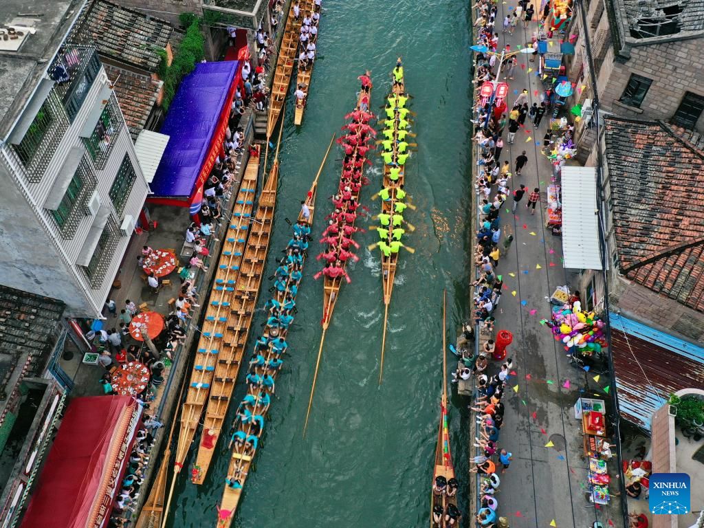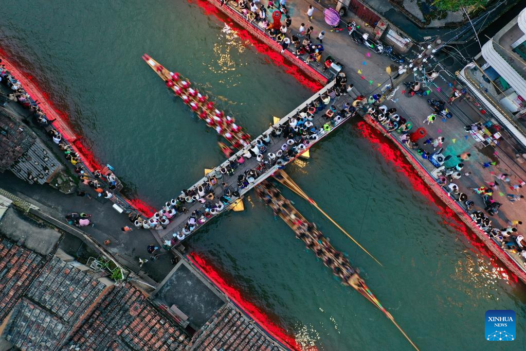 This aerial photo taken on June 18, 2023 shows a nighttime dragon boat race held to celebrate the Dragon Boat Festival in Sanxi Village of Changle District, Fuzhou, capital of southeast China's Fujian Province.