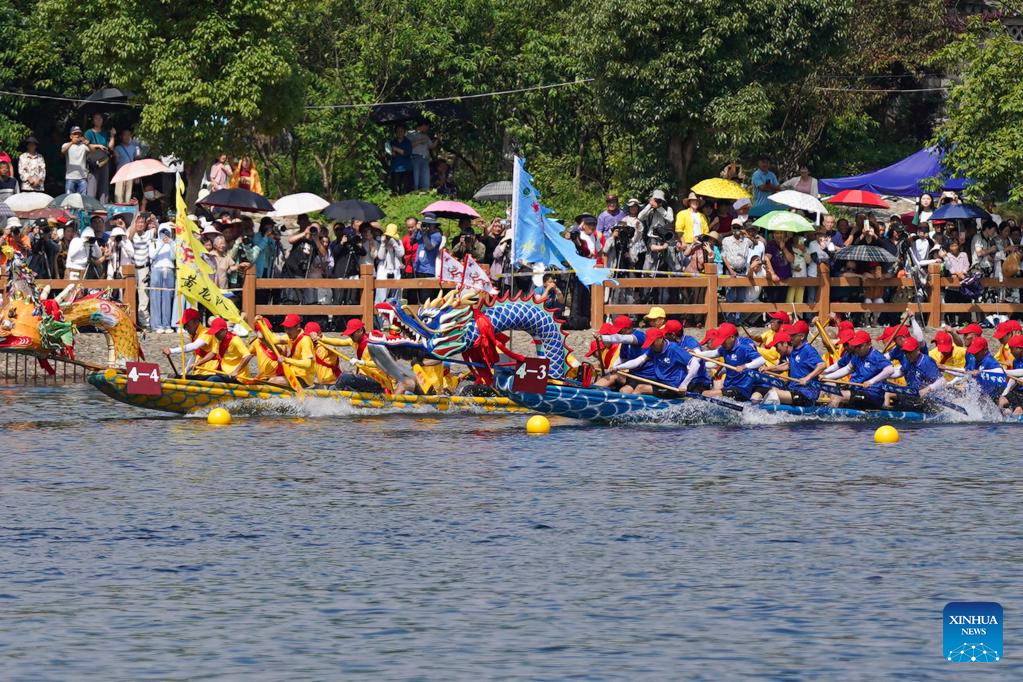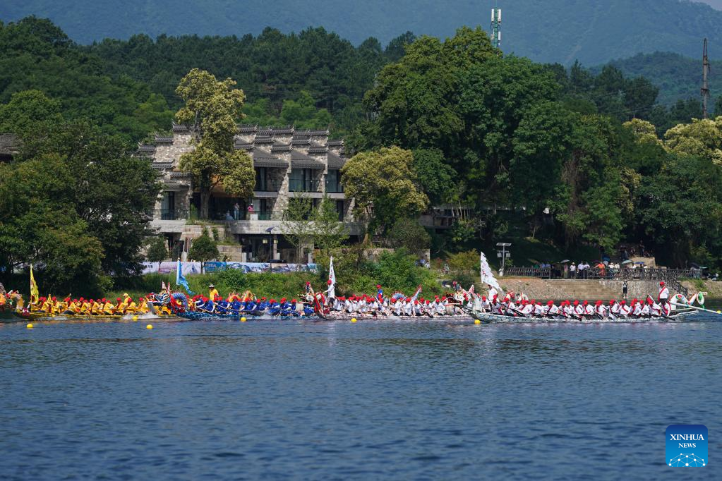 Dragon boats take part in a race in Taohuatan Township, Jingxian County, east China's Anhui Province, June 21, 2023. A total of 25 teams participated in a dragon boat race, which opened here Wednesday, to celebrate the Dragon Boat Festival. This year's festival falls on June 22. (Xinhua/Du Yu)