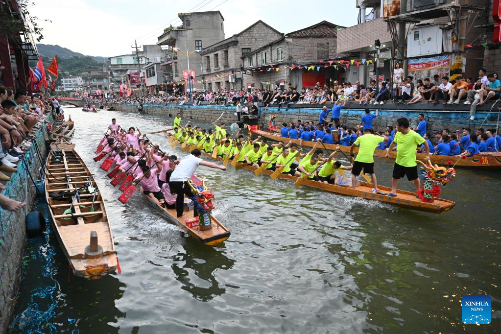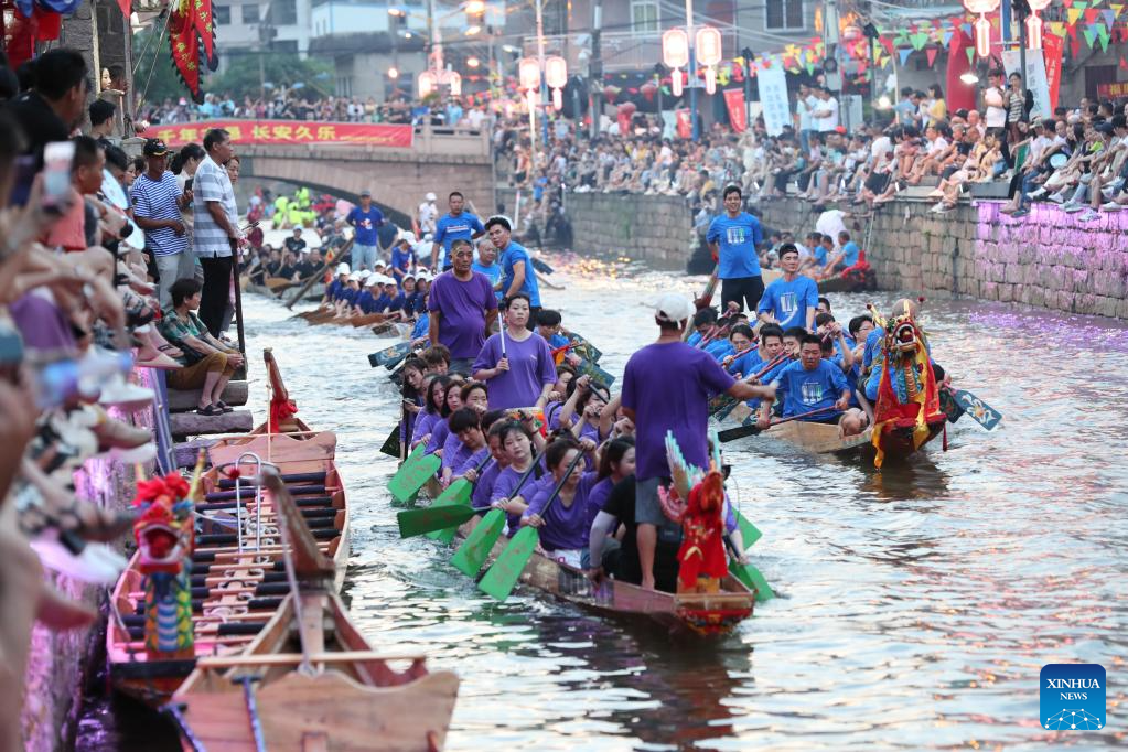 The nighttime dragon boat race native to Sanxi Village is a tradition with a history spanning over 600 years. Around the Chinese Dragon Boat Festival, the villagers of Sanxi eagerly participate in this race as night falls. The event carries deep cultural significance and serves as a means of prayer for bountiful harvests and auspicious life. (Xinhua/Jiang Kehong)