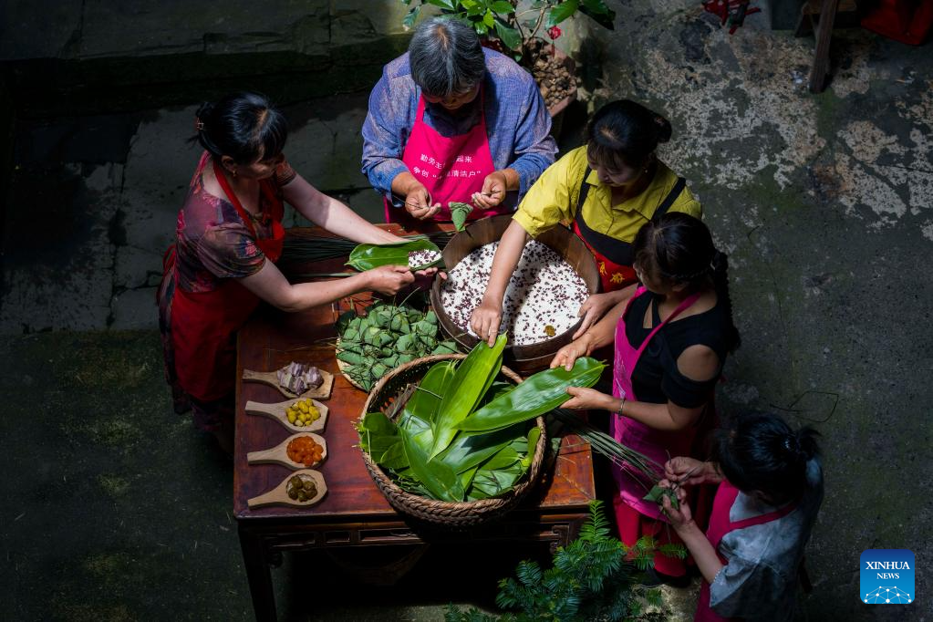 Villagers make Zongzi, a pyramid-shaped glutinous rice dumpling wrapped in bamboo or reed leaves, as the Dragon Boat Festival approaches in Hule Town of Ningguo City, east China's Anhui Province, June 17, 2023. Hule Town, an ancient town in east China's Anhui Province, has a tradition of lantern performance to celebrate festivals. Villagers perform lantern dance with lanterns in the shape of fish and dragon, and place lotus-shaped water lanterns in the river. A series of activities including the long-table banquet and the lantern fair have been held to attract tourists from home and abroad. (Photo by Li Xiaohong/Xinhua)