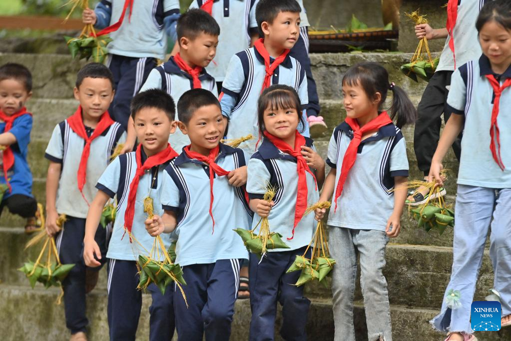 Students are pictured with freshly made Zongzi in Dangjiu Village, Gandong Township of Rongshui Miao Autonomous County, south China's Guangxi Zhuang Autonomous Region, June 20, 2023. A series of public events in celebration of the Dragon Boat Festival were held for students here on Tuesday to help them better understand the charms of traditional Chinese culture. Zongzi, a pyramid-shaped dumpling made of glutinous rice wrapped in bamboo or reed leaves, is always a popular food on this occasion. (Xinhua/Huang Xiaobang)