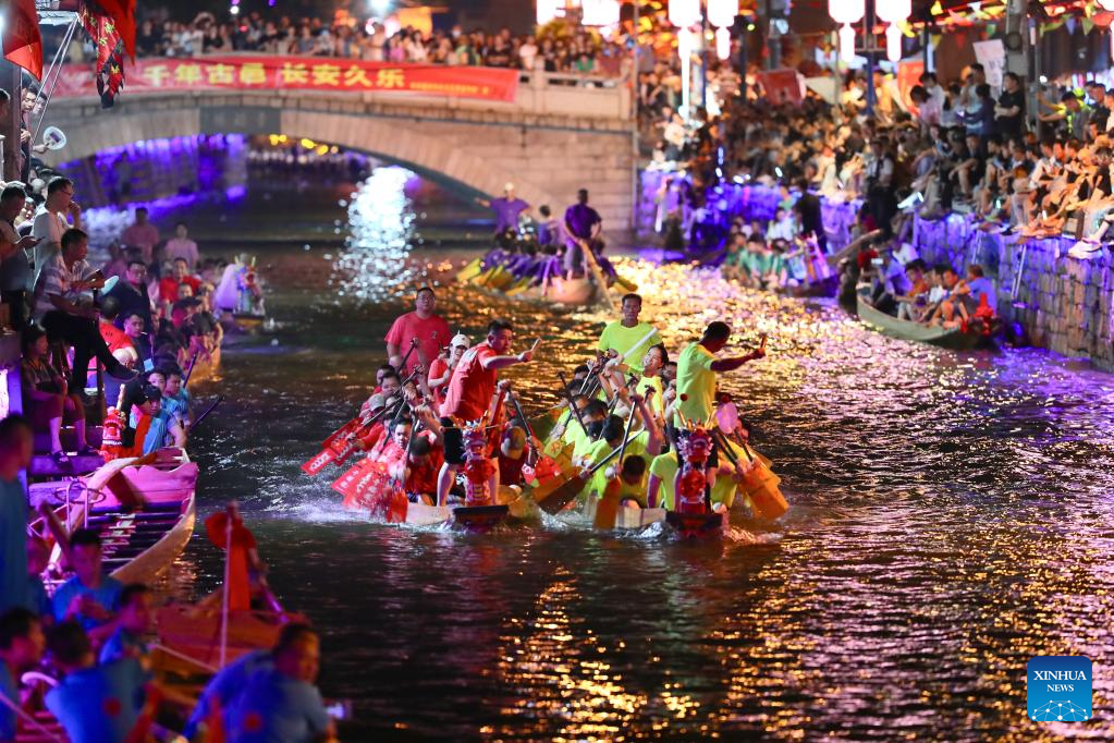 A nighttime dragon boat race is held to celebrate the Dragon Boat Festival in Sanxi Village of Changle District, Fuzhou, capital of southeast China's Fujian Province, June 20, 2023.