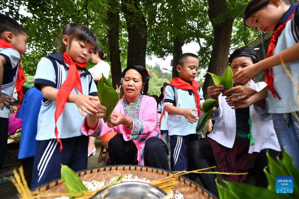 Students learn from the elders to make Zongzi in Dangjiu Village, Gandong Township of Rongshui Miao Autonomous County, south China's Guangxi Zhuang Autonomous Region, June 20, 2023. A series of public events in celebration of the Dragon Boat Festival were held for students here on Tuesday to help them better understand the charms of traditional Chinese culture. Zongzi, a pyramid-shaped dumpling made of glutinous rice wrapped in bamboo or reed leaves, is always a popular food on this occasion. (Xinhua/Huang Xiaobang)