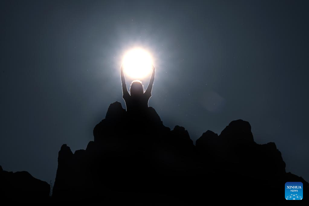 A person poses for a photo as the sun rises on the summer solstice at the ancient megalithic observatory of Kokino, North Macedonia, June 21, 2023. (Photo by Tomislav Georgiev/Xinhua)