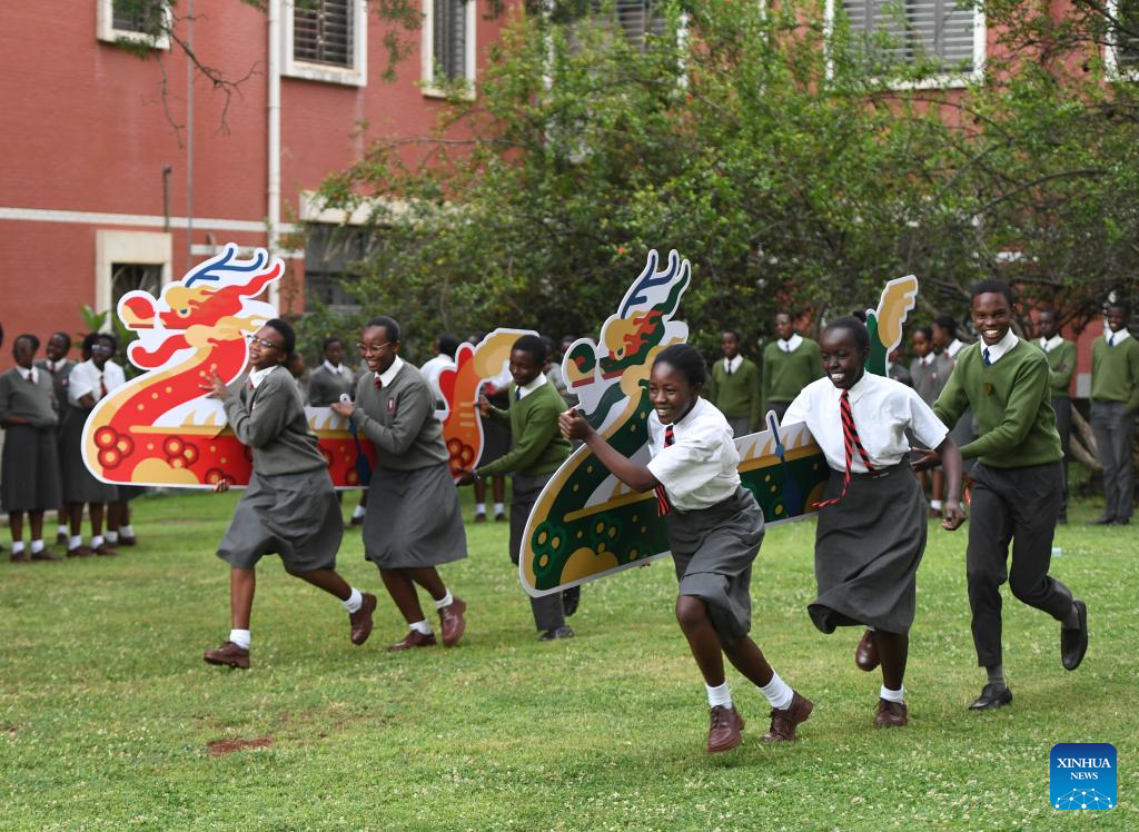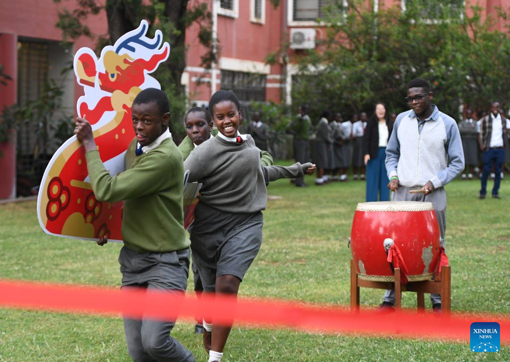 Students participate in a simulated dragon boat race during an interactive session held by the Chinese Embassy in Kenya in Nairobi, Kenya, on June 21, 2023. The Chinese Embassy in Kenya on Wednesday held the interactive session with Kenyan students to deepen cooperation in the fields of education and culture. (Xinhua/Li Yahui)
