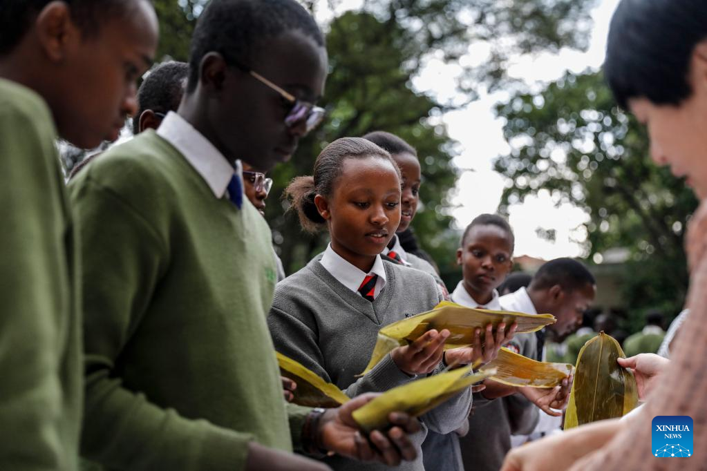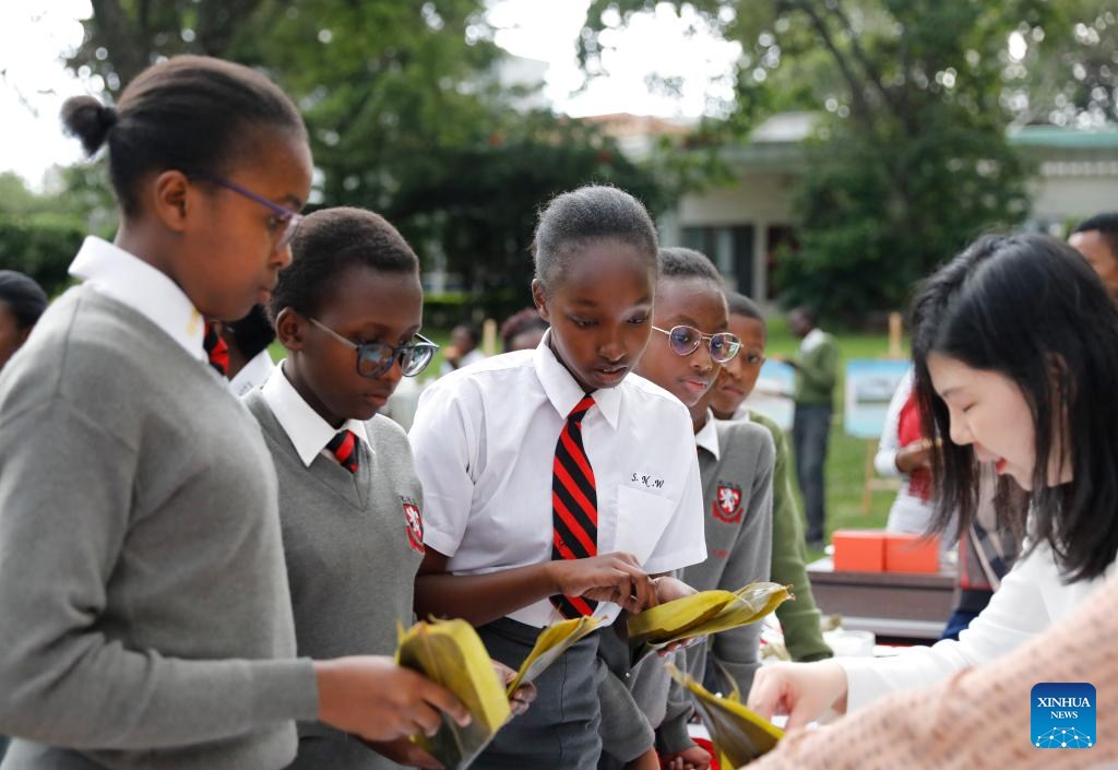 Students learn to make Zongzi (traditional sticky rice dumplings) during an interactive session held by the Chinese Embassy in Kenya in Nairobi, Kenya, on June 21, 2023. The Chinese Embassy in Kenya on Wednesday held the interactive session with Kenyan students to deepen cooperation in the fields of education and culture. (Xinhua/Li Yahui)