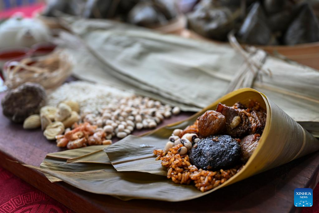 This photo taken on June 18, 2023 shows the materials for making Zongzi, a pyramid-shaped dumpling made of glutinous rice wrapped in bamboo or reed leaves, in Malacca, Malaysia. Activities like Zongzi-making and dragon boat race were held in Malacca to greet the upcoming Dragon Boat Festival. (Xinhua/Cheng Yiheng)