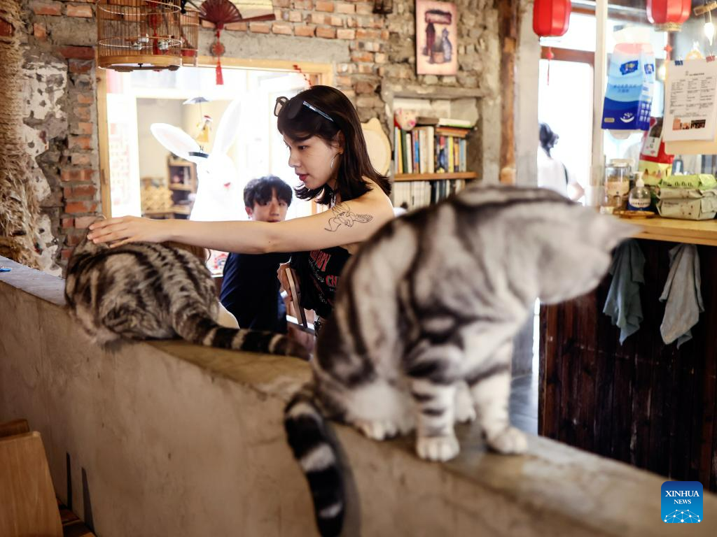 A customer interacts with a cat at Gudaomaone cat cafe in Xiaojuer Hutong of the Nanluoguxiang neighborhood in Beijing, capital of China, June 10, 2023.