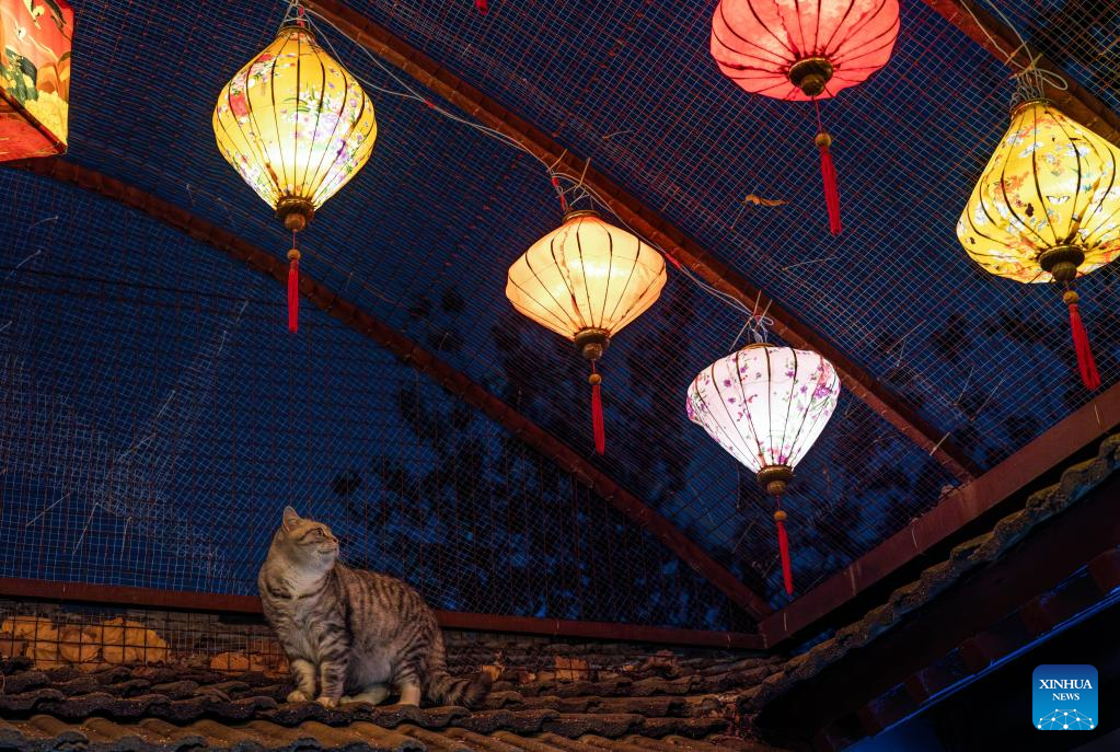 Cat Xiaowu patrols on the roof of Gudaomaone cat cafe in Xiaojuer Hutong of the Nanluoguxiang neighborhood in Beijing, capital of China, June 19, 2023.