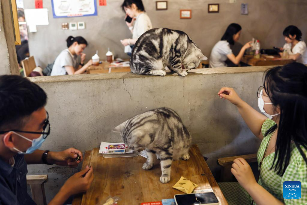 Customers interact with cats at Gudaomaone cat cafe in Xiaojuer Hutong of the Nanluoguxiang neighborhood in Beijing, capital of China, June 10, 2023.