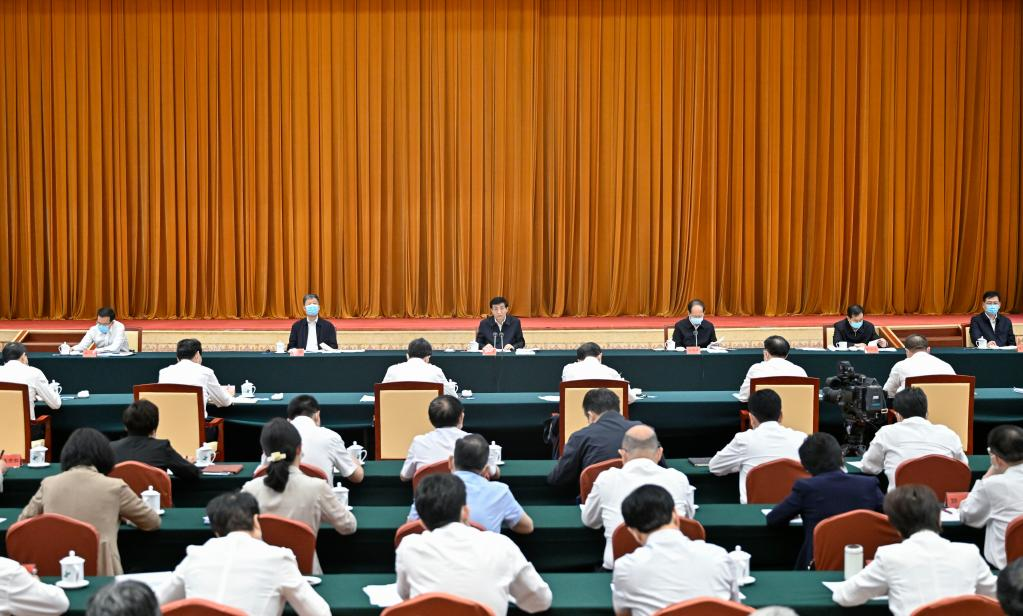 Wang Huning, a member of the Standing Committee of the Political Bureau of the Communist Party of China (CPC) Central Committee and chairman of the National Committee of the Chinese People's Political Consultative Conference, speaks at a meeting on the important remarks on the religious work by Xi Jinping, general secretary of the CPC Central Committee, in Beijing, capital of China, June 21, 2023. (Xinhua/Yin Bogu)