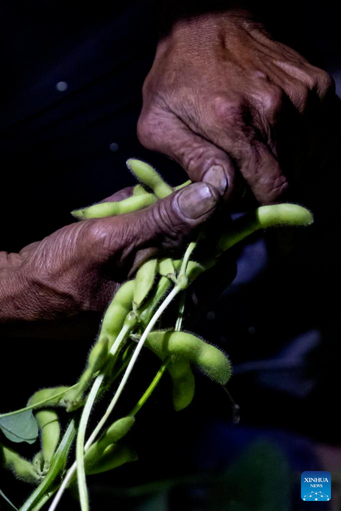 A farmer harvests green soybeans in fields at night in Guancang of Jintang County, Chengdu of southwest China's Sichuan Province, June 19, 2023. Guancang Community is an agricultural production center in Jintang County of Chengdu, with an annual production of green soybean of 82,000 tonnes and annual value output of 320 million yuan (about 44.57 million U.S. dollars).