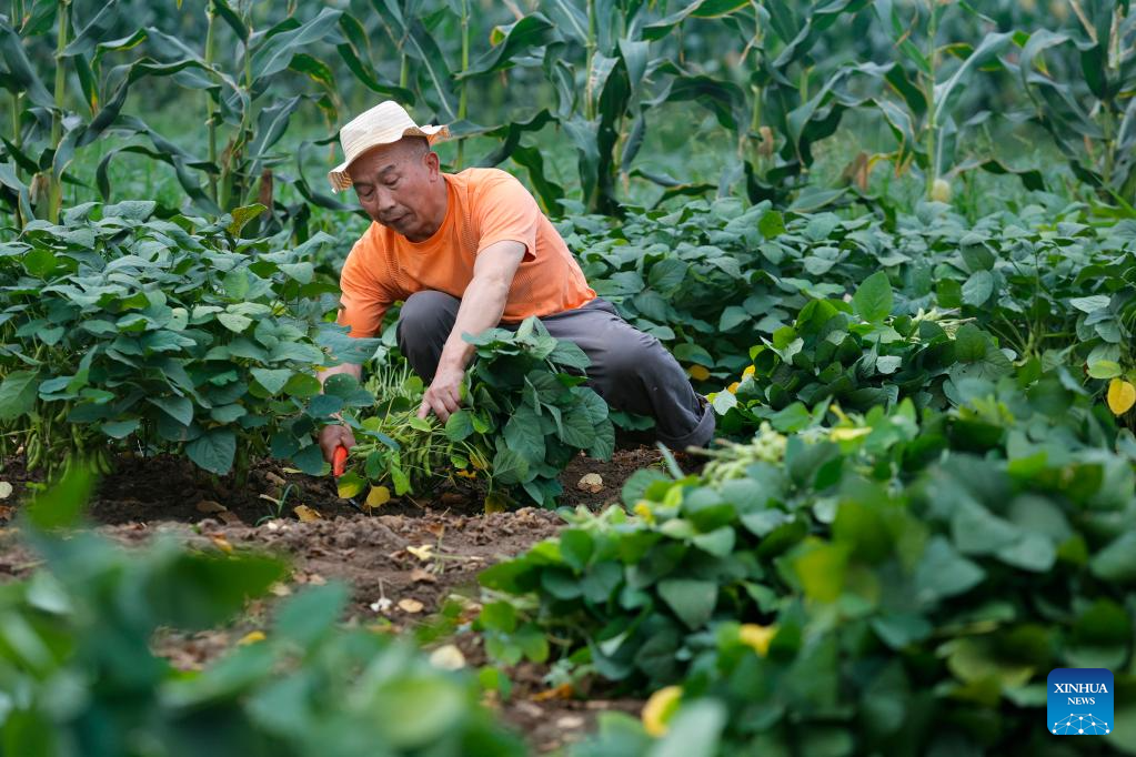 A farmer harvests green soybeans in a field in Guancang of Jintang County, Chengdu of southwest China's Sichuan Province, June 19, 2023. Guancang Community is an agricultural production center in Jintang County of Chengdu, with an annual production of green soybean of 82,000 tonnes and annual value output of 320 million yuan (about 44.57 million U.S. dollars).