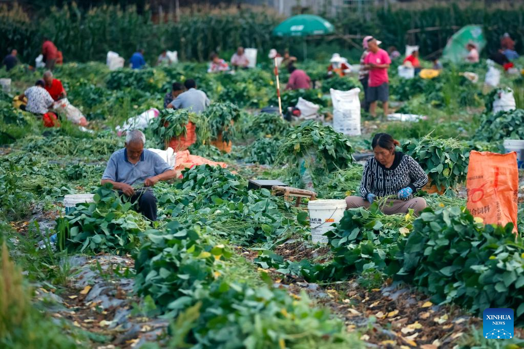 People harvest green soybeans in fields in Guancang of Jintang County, Chengdu of southwest China's Sichuan Province, June 19, 2023. Guancang Community is an agricultural production center in Jintang County of Chengdu, with an annual production of green soybean of 82,000 tonnes and annual value output of 320 million yuan (about 44.57 million U.S. dollars).