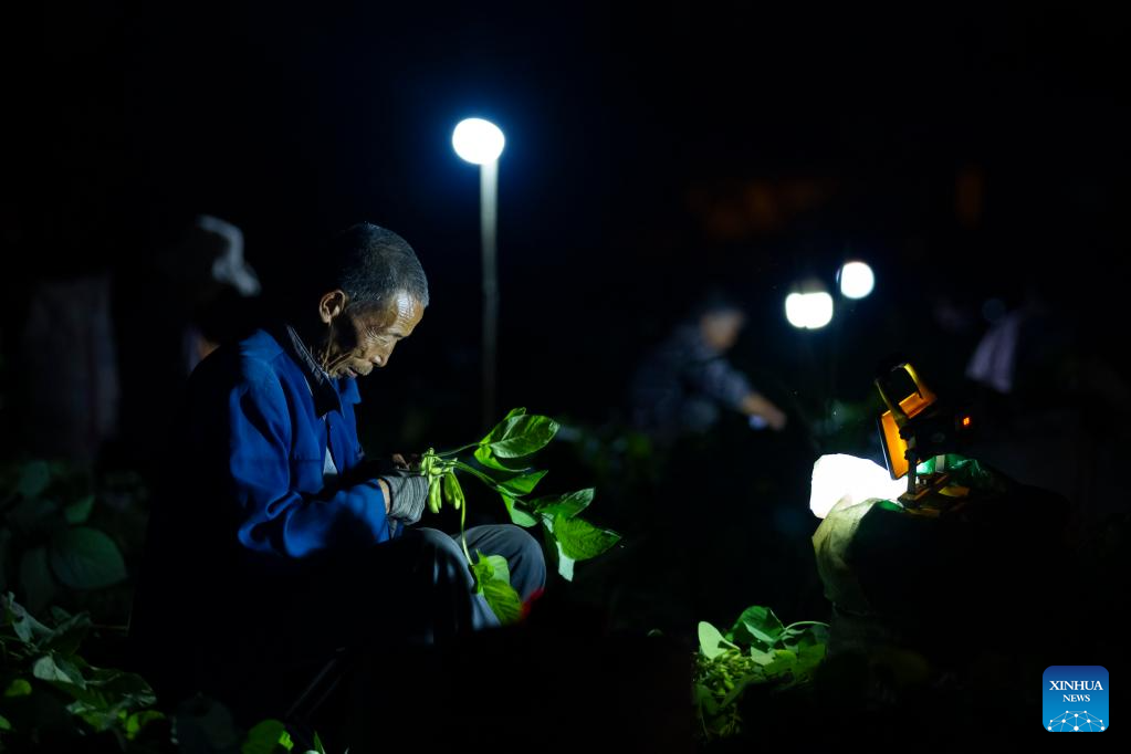 A farmer harvests green soybeans in fields at night in Guancang of Jintang County, Chengdu of southwest China's Sichuan Province, June 19, 2023. Guancang Community is an agricultural production center in Jintang County of Chengdu, with an annual production of green soybean of 82,000 tonnes and annual value output of 320 million yuan (about 44.57 million U.S. dollars).