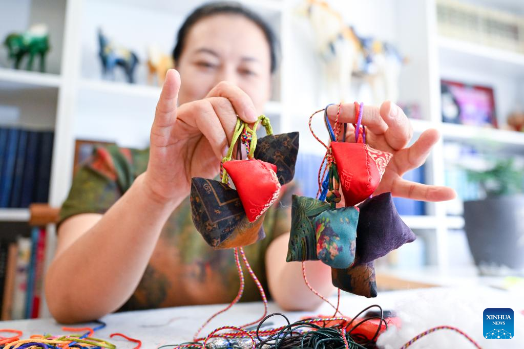 Chen Yuqiu shows sachets she made at home in Jilin, northeast China's Jilin Province, June 20, 2023. Chen Yuqiu, 55 years old, is an inheritor of the national-level intangible cultural heritage of Manchu cheongsam making. In order to make people aware of the traditional Chinese culture and Manchu cheongsam, she taught people to make sachets at the Jilin Museum and sent them to citizens before the Dragon Boat Festival. (Xinhua/Yan Linyun)