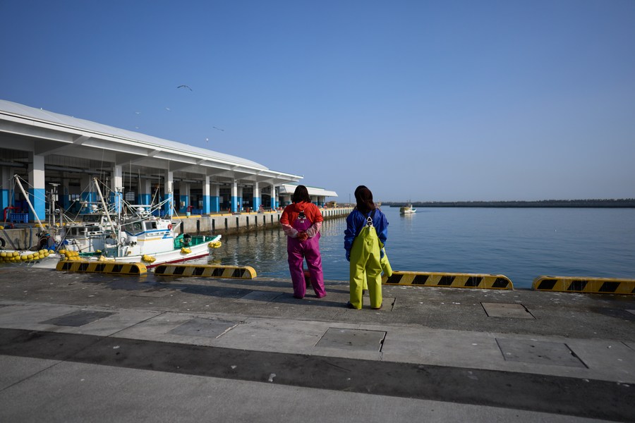 Fishermen wait for fishing boats on a bank in Soma City, Fukushima Prefecture, Japan, March 8, 2023. (Xinhua/Zhang Xiaoyu)